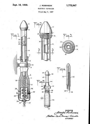 The first electronic cigarettes, however, were invented in the twentieth century. On the 3rd May 1927, Joseph Robinson walked up the steps of the New York patent office to file a patent for a device he called a ‘Mechanical Butane Ignition Vaporizer.’ “My invention,” he explained, “relates to vaporising devices for holding medicinal compounds which are electrically heated to produce vapors for inhalation.” It was approved in 1930 but Robinson never brought it to market, and the technology lay dormant for a few decades.